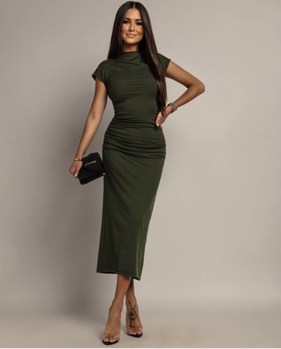 Prążkowana sukienka damska midi w kolorze khaki – połączenie stylu, wygody i kobiecej elegancji!